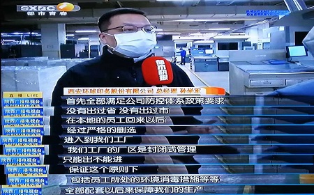 2020年2月10日早上,陜西電視臺都市快報欄目對環(huán)球印務股份有限公司進行了探訪,主要圍繞復工復產情況下,公司防疫聯控措施開展情況進行了解。公司總經理孫學軍先生分別從四個方面對公司疫情防控工作進行了詳細介紹。一是嚴格落實返崗信息登記。實行一人一檔,準確掌握返崗員工和家庭成員健康狀況。二是嚴格落實日常防控措施
